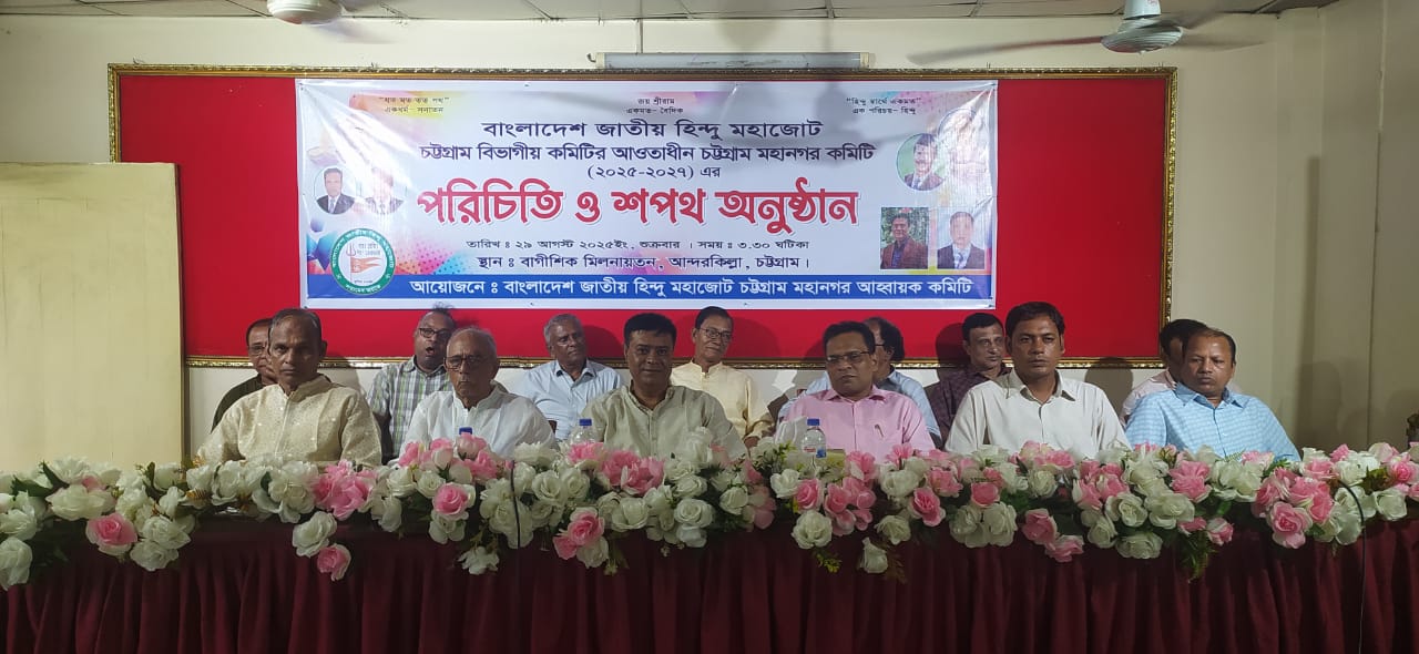 মিলন বৈদ্য শুভ, (চট্টগ্রাম):-বাংলাদেশ জাতীয় হিন্দু মহাজোট চট্টগ্রাম বিভাগীয় কমিটির আওতাধীন চট্টগ্রাম মহানগরের নবনির্বাচিত কমিটি ঘোষণা,পরিচিতি ও শপথ গ্রহণ অনুষ্ঠান বাংলাদেশ জাতীয় হিন্দু মহাজোট চট্টগ্রাম বিভাগীয় কমিটির সহ সাধারণ সম্পাদক ও কমিটি গঠন কল্পে গঠিত আহবায়ক কমিটির সম্মানিত আহবায়ক দয়াল কান্তি সামন্ত এর সভাপতিত্বে ২৯ আগস্ট ২০২৫ শুক্রবার বিকাল ৩.৩০ ঘটিকায় চট্টগ্রাম আন্দরকিল্লাস্থ বাগীশিক মিলনায়তনে অনুষ্টিত হয়।সমবেত কন্ঠে শ্রীমদ্ভগবদগীতা পাঠের মাধ্যমে অপূর্ব ধর এর সঞ্চালনায় শুরু হয়।এতে প্রধান অতিথি ছিলেন বাংলাদেশ জাতীয় হিন্দু মহাজোট চট্টগ্রাম বিভাগীয় কমিটির সভাপতি প্রকৌ. নীপেশ রঞ্জন হোড়। বিশেষ অতিথি ছিলেন নির্বাহী সভাপতি শ্রী হরিনারায়ণ ভট্টাচার্য্য, সাধারণ সম্পাদক শ্রী কৃষ্ণপদ আচার্য্য,সহ সাধারণ সম্পাদক বিমল কান্তি নাথ,দপ্তর সম্পাদক সুজিত দাশ,অর্থ সম্পাদক বনবিহারী আচার্য্য,সহ সাংগঠনিক সম্পাদক শিমুল কুমার নাথ,সহ ধর্ম ও সাংস্কৃতিক বিষয়ক সম্পাদক সঞ্জয় আচার্য্য,চট্টগ্রাম দক্ষিণ জেলার সভাপতি মৃদুল কান্তি বৈদ্য।বাংলাদেশে সংখ্যালঘুদের উপর যে চলমান পরিস্থিতি শুরু হয়েছে তার থেকে মুক্তির একমাত্র পথ পৃথক নির্বাচন ব্যবস্থা। এটা এখন সনাতনীদের একমাত্র মুক্তির সনদ।এজন্য সকল সনাতনীদের ঐক্যবদ্ধ আন্দোলন গড়ে তুলতে হবে।আগামীতে কেন্দ্রীয় মহাসচিব এড.গোবিন্দ চন্দ্র প্রমানিক হিন্দুদের দাবী আদায়ে যে মহাসমাবেশের ডাক দিবে তা সফল করার জন্য বাংলাদেশ জাতীয় হিন্দু মহাজোটের সর্বস্তরের নেতা কর্মীদের তৃণমূল পর্যায়ের হিন্দুদের নিয়ে দাবী আদায়ে কাজ করতে হবে। বাংলাদেশ জাতীয় হিন্দু মহাজোট চট্টগ্রাম বিভাগীয় কমিটির ভারপ্রাপ্ত সাধারণ সম্পাদক পলাশ কান্তি নাথ প্রধান বক্তার বক্তব্যে এসব কথা বলেন।প্রধান অথিতি তার বক্তব্যে বলেন নবগঠিত চট্টগ্রাম মহানগর কমিটি তাদের নিজ নিজ দায়িত্ব যথাযথ ভাবে পালন করে নির্যাতিত নিপীড়িত হিন্দুদের পাশে থেকে যেন কাজ করেন।তিনি আরো বলেন আগামী তিন মাসের মধ্যে মহানগরের সমস্ত থানা কমিটি গুলো গঠন করে সাংগঠনিক শক্তিকে মজবুত করবে।সভায় স্বাগত বক্তব্য রাখেন আহবায়ক কমিটির সদস্য সচিব শ্রী উত্তম চক্রবর্তী। আরো বক্তব্য রাখেন লায়ন সুভাষ দাশ, এড. উত্তম কুমার রায় ,উত্তম বিশাংগীরি, লিটন কান্তি শীল। সভায় শ্যামল কান্তি নাথকে সভাপতি, এডভোকেট উত্তম কুমার রায়কে সাধারণ সম্পাদক, বাবলু আচার্য্যকে অর্থ সম্পাদক ও লিটন কান্তি শীলকে সাংগঠনিক সম্পাদক করে ৫১ সদস্য বিশিষ্ট একটি পূর্ণাঙ্গ কমিটি ঘোষনা করা হয়। সভায় বক্তাগণ বাংলাদেশ জাতীয় হিন্দু মহাজোট কেন্দ্রীয় কমিটির মহাসচিব এড.গোবিন্দ চন্দ্র প