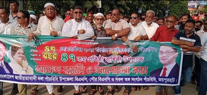 মাছুম মন্ডল,জয়পুরহাট জেলা প্রতিনিধি:জয়পুরহাটের পাঁচবিবি উপজেলা বিএনপির আয়োজনে পাঁচবিবি পাঁচমাথাতে বিকাল ৫ টায় ৩ সেপ্টেম্বর মিছিল ও আলোচনা সভা অনুষ্ঠিত হয়।