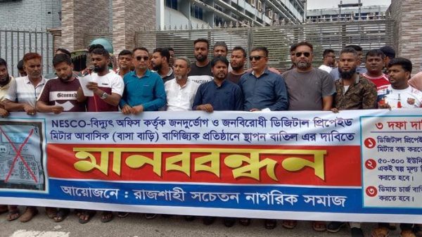 মো: গোলাম কিবরিয়া,রাজশাহী জেলা প্রতিনিধি:-রাজশাহীতে প্রিপেইড মিটার বাতিলের দাবিতে মানববন্ধন হয়েছে । রাজশাহীতে নর্দার্ন ইলেকট্রিসিটি সাপ্লাই কোম্পানি (নেসকো) কর্তৃক স্থাপিত প্রিপেইড মিটার বাতিলসহ তিন দফা দাবিতে মানববন্ধন হয়েছে। রাজশাহী
