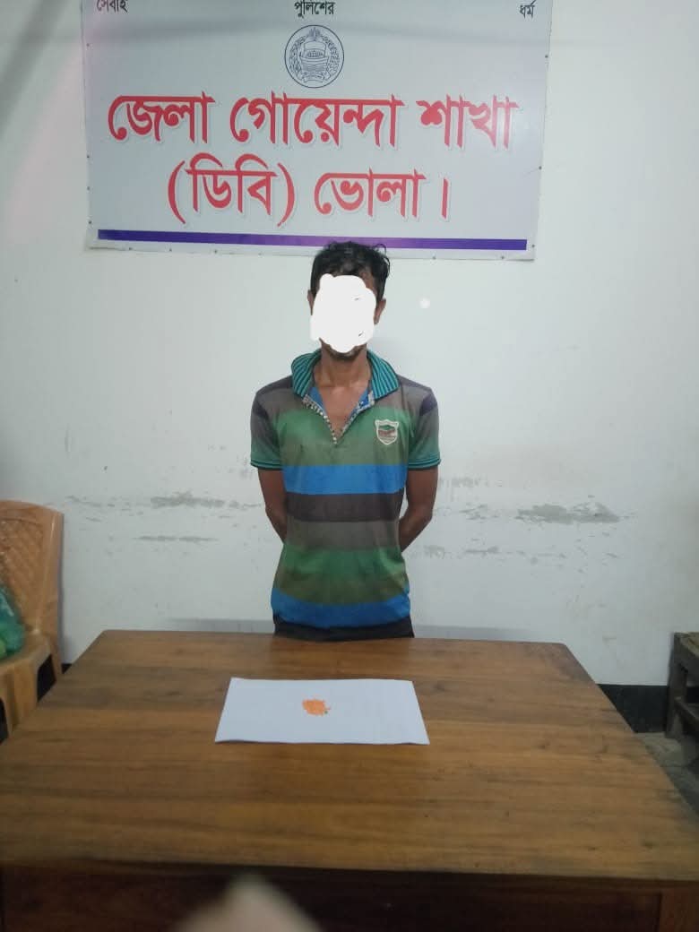 রবিবার (২১ সেপ্টেম্বর ২০২৫ খ্রিঃ) রাত ১১টা ১০ মিনিটের দিকে ভোলা সদর মডেল থানাধীন ভোলা পৌরসভার ৪নং ওয়ার্ডের মধ্য চরনোয়াবাদ মুন্সি বাড়ীর সামনে পাকা রাস্তার উপর থেকে তাকে আটক করা হয়।
