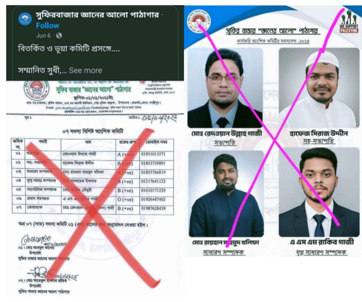 সকলের সদয় অবগতির জন্য জানানো যাচ্ছে যে, সুফির বাজার "জ্ঞানের আলো" পাঠাগারে ৫ জুন ২০২৫ একটি ভূয়া কমিটি ঘোষণা করা হয়েছে।